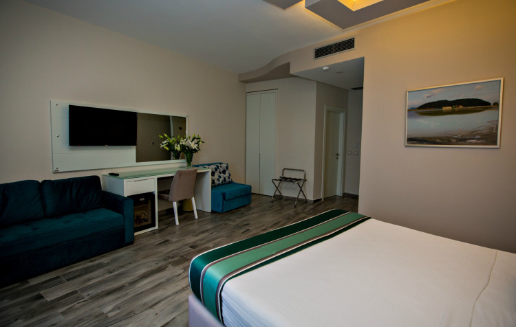 Perfectly positioned and conceived to embody luxury, our Deluxe Room offers the maximum a hotel room can offer. Combining contemporary style with coziness and sophisticated elegance, this room will make you experience a feeling you would always long to repeat. With light, relaxing colors, the room offers the feeling of maximum wellbeing. The king-sized bed, and a large comfortable sofa for two children, make the Deluxe Room ideal for your luxurious vacation.